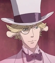 Gentle is a handsome young man with blonde hair, blue eyes, a monocle, a white suit, and a white top hat.