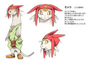 Meow (like others of his race) resembles a cat, with large yellow eyes and a tan fur covered body. His hands, feet, belly, and the tip of his tail are grey and he has a streak of brown fur that looks like a shooting star running from his scalp down to his back. He sports a red cap, a light green garment he says is a sarong, a brown satchel he uses to carry his phone, and a pair of orange nursing Crocs.